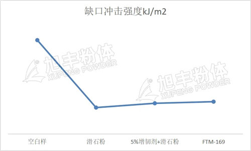 從上圖可以看出,FTM-169較添加5%增韌劑體系,具有較高的懸臂梁缺口沖擊強度,同時相對添加滑石粉后下降的幅度最小,這說明FTM-169在ABS樹脂中可以大大減輕因滑石粉產生的沖擊強度下降,具有良好的增韌效果。