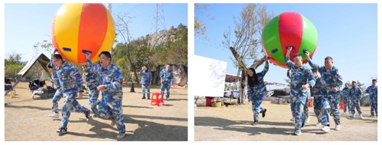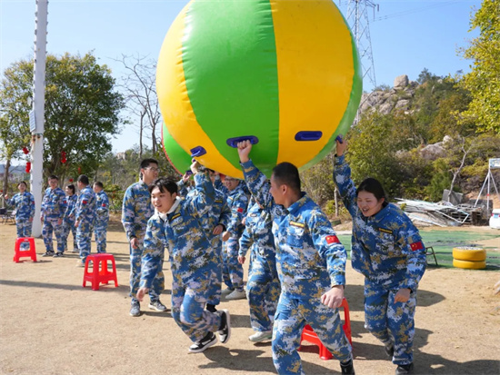 隨后的“運轉(zhuǎn)乾坤”項目,巨大的充氣球需要團隊成員共同發(fā)力,協(xié)調(diào)步伐才能快速前進。