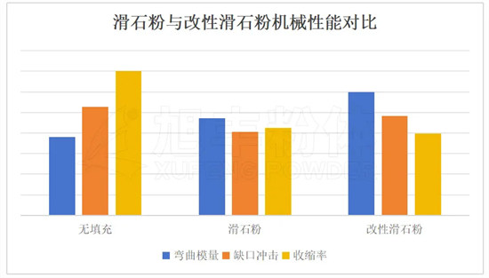 從上圖中可以看出,添加滑石粉后的聚丙烯復合材料雖然能夠提高彎曲模量,減少收縮率,但沖擊性能下降明顯;而經(jīng)過改性處理后的滑石粉在聚丙烯復合材料中的沖擊強度、彎曲模量相較于未改性的滑石粉均有較明顯的提升。