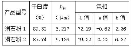 白度(whiteness)是表示物質表面白色的程度,以白色含有量的百分率表示。非金屬礦物粉體的白度有干白度和濕白度之分,干白度是反映非金屬礦物粉體表觀的白色程度;濕白度是反映非金屬礦物粉體在油性介質中,還原粉體原礦色相后的白色程度。故在實際應用過程中,我們會發現,兩支粉體的干白度檢測結果接近,但生產出來的成品顏色卻完全不同。為此,我司進行了如下實驗:選擇兩支干白度比較接近的滑石粉,按同一配方比例填充于PET(聚對苯二甲酸乙二醇酯),粉體檢測結果詳見下表。