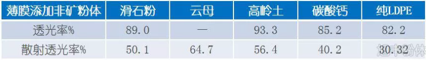 農作物光合作用的有效波長是0.4-0.7μm,與可見光基本一致。添加含硅類材料(高嶺土、滑石粉、云母)的薄膜對7-25μm紅外線的阻隔作用明顯優于不含硅的無機填料,添加不同非金屬礦物粉體材料的線性低密度聚乙烯薄膜透光性能比較:
