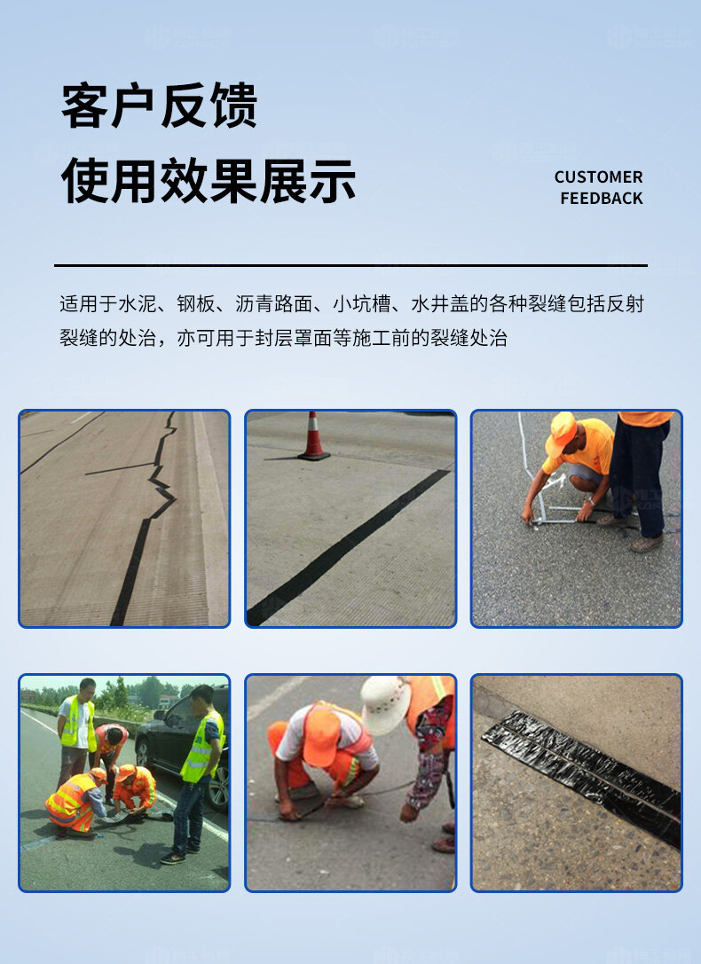 適用于水泥、鋼板、瀝青路面、小坑槽、水井蓋的各種裂縫包括反射裂縫的處治,亦可用于封層罩面等施工前的裂縫處治??梢宰柚沽芽p松散、滲水、崩邊、崩縫、坑槽。
