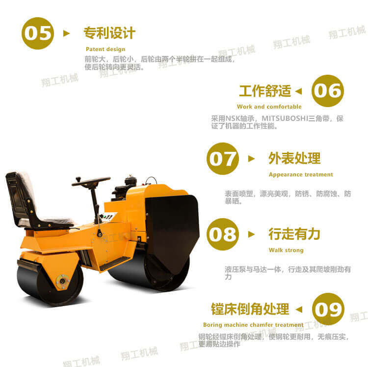 山東翔工XYL-850座駕壓路機=無縫鋼輪 進口軸承(軸承決定壽命) 原裝進口美國丹弗斯液壓系統 加黃油的黃油孔 常發6馬力風冷柴油機 無極變速 2t壓實力 電磁離合振動 單獨的震動按鈕 前進后退手柄 可靜碾可震動 鋼輪采用鏜床技術(故障率更低)。