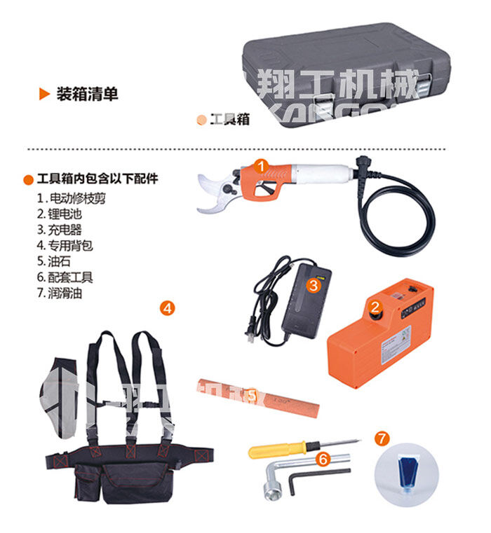 本產品為電池驅動電動修枝剪,由固定刀片、移動刀片、鋰電池、充電器、連接線、工作包、工具箱等部分組成,充電電壓為AC 110V~240V,主要應用于30mm以下果枝嫁接的剪切和修剪及大批果園修剪、收摘等。使用時簡捷方便,是傳統手工剪枝效率的8-10倍,修枝質量明顯高于傳統手工剪刀。