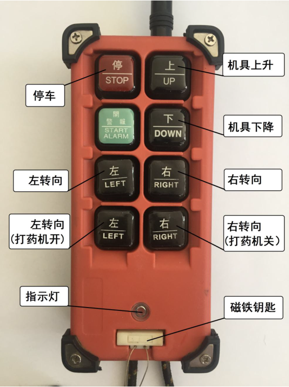 注:遙控器在使用過程中,電池的電量會影響實際控制距離,提醒用戶注意檢查,及時更換電池(2節五號電池),長時間不用應將磁鐵鑰匙取下,避免跑電。