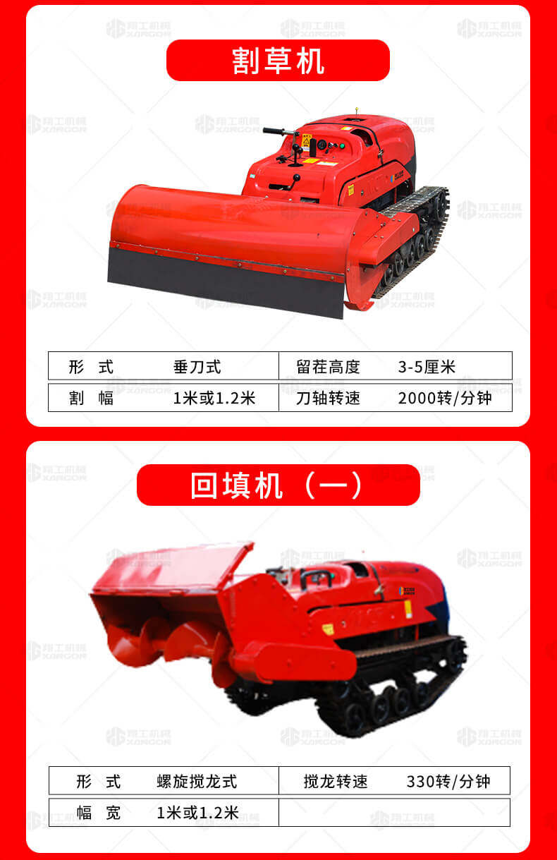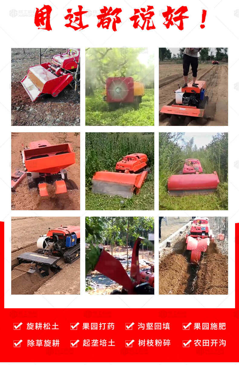 本產品操作方式為遙控操作,車身超低,可原地轉向,是專門針對果園開發的新型產品。主機可配裝多種機具,可旋耕,除草,開溝,割草,施肥等,適用于各種果園樹下的田間管理。省力效率高,節省勞力減輕勞動強度。