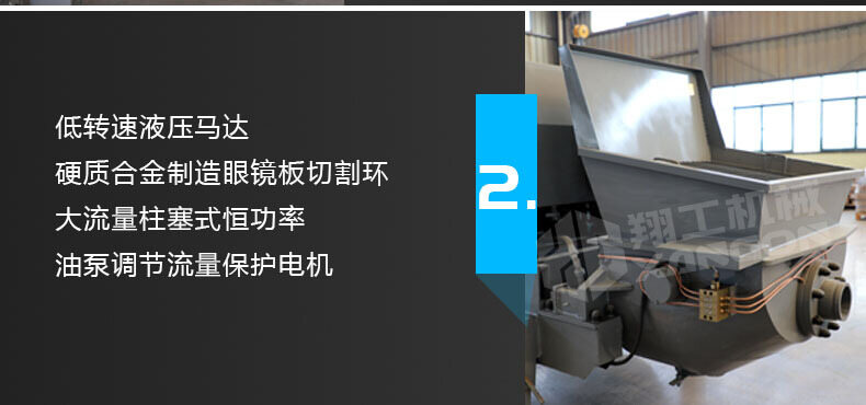 產品特點: 1,大流量 采用加粗料缸,讓機械每一次循環出料多20% 。 2,效率高 移動便捷全部采用快接式管道卡,提高工作效率 。 3,便捷 本機可遠程遙控,操作不受地點限制,更加人性化。
