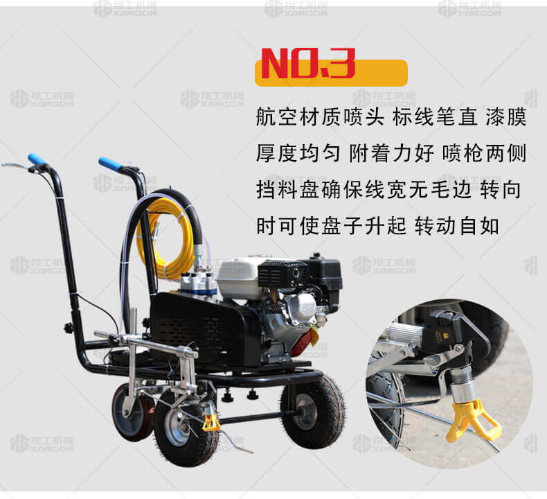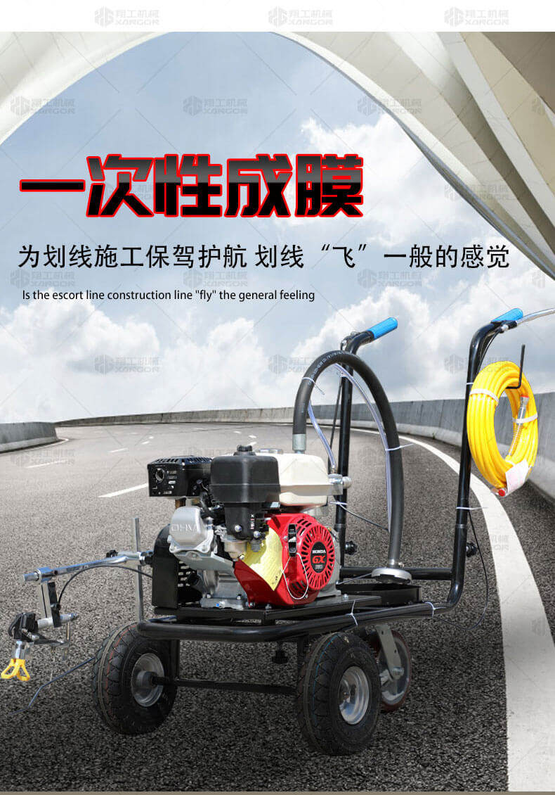冷噴劃線機(jī)是常溫標(biāo)線施工的專用設(shè)備。主要適用于公路、市區(qū)停車場、機(jī)場等涂劃直線、虛線、曲線、斑馬線、文字、箭頭、圖形標(biāo)志等。形成高壓進(jìn)行噴涂,流量大、壓力穩(wěn)。所劃標(biāo)線線型清晰、附著力強(qiáng)、厚薄均勻、邊齊角齊。具有操作靈活、工作效率高、施工快捷方便、應(yīng)用范圍廣等特點。