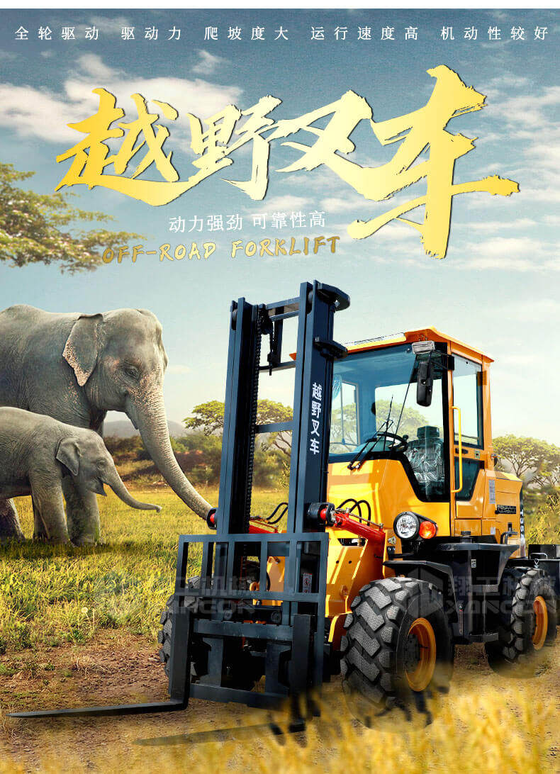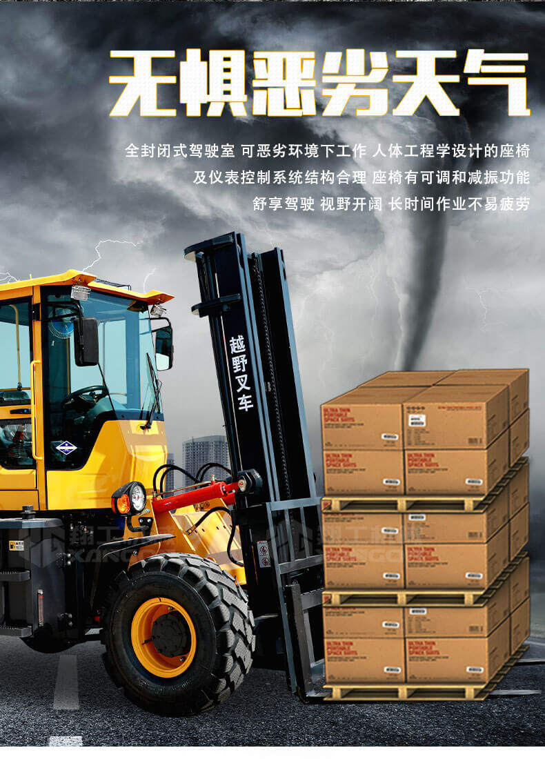 3.普通叉車只能在平整的路面上作業,而越野叉車既可以在普通路面上作業,還可以在山路泥路崎嶇道路作業,輪胎抓地力強,不打滑。