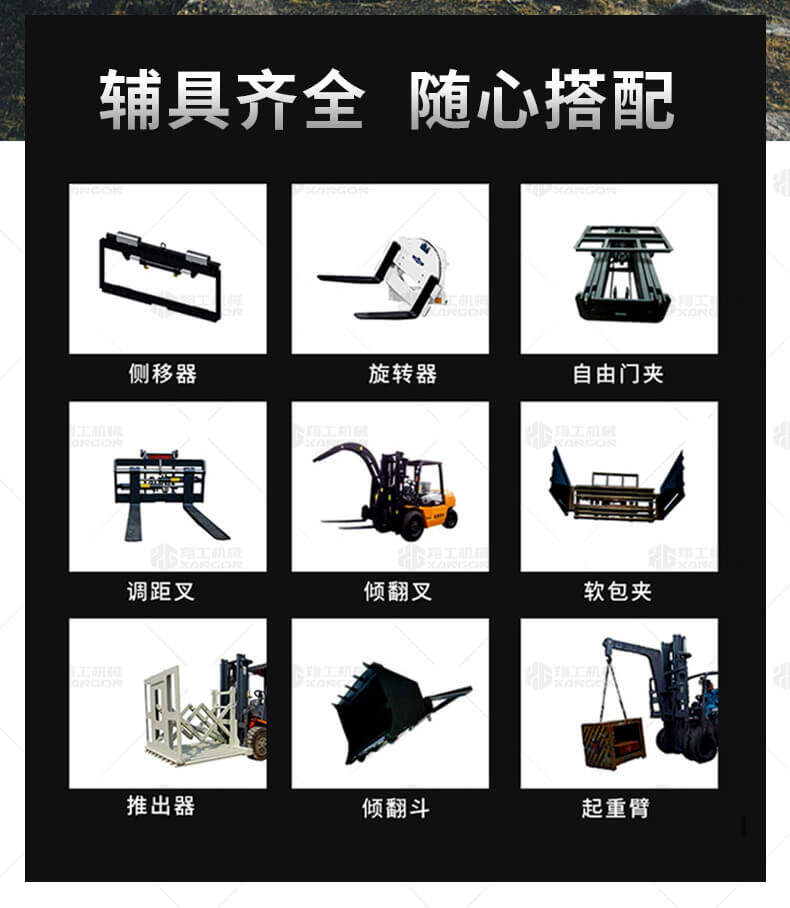 越野叉車可以在坡地和不平地面上進行貨物裝、卸、堆垛及搬運作業,具有良好的機動性、越野性可靠性。其功能多樣,可搭配側移器、調距叉、旋轉器、軟包夾、推出器、側翻叉、側翻斗、起重臂等工具完成不同的工作。