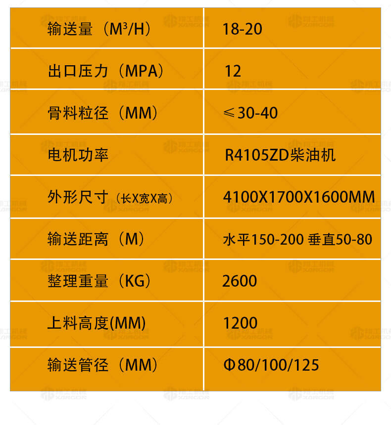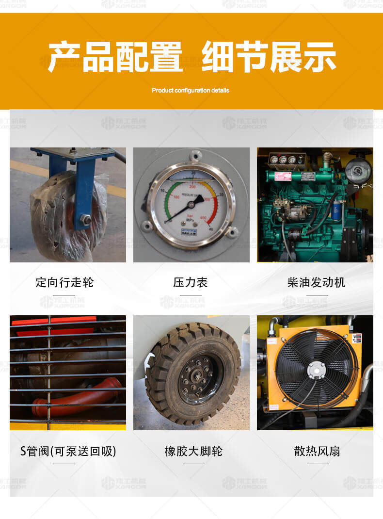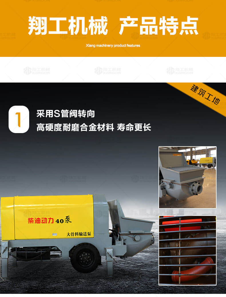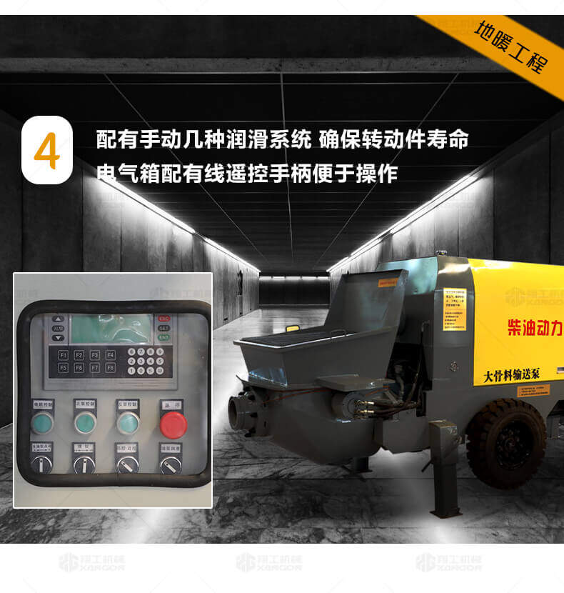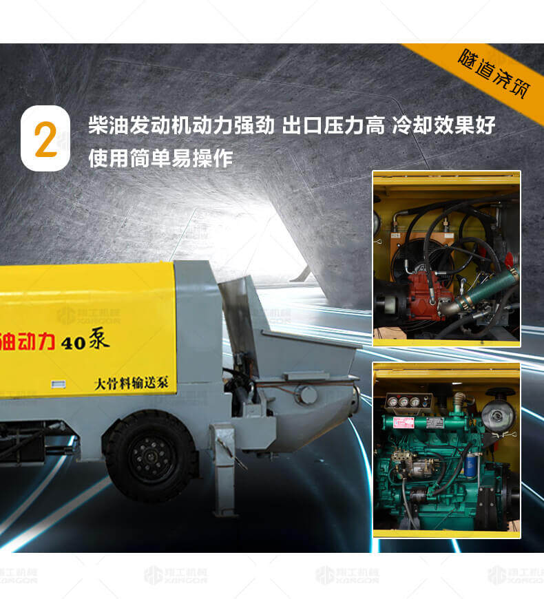 大骨料混凝土輸送泵主要用于坡道灌漿、水平地面、隧道澆筑。模板灌漿等。移動便捷全部采用快接式管道卡,提高工作效率 。
