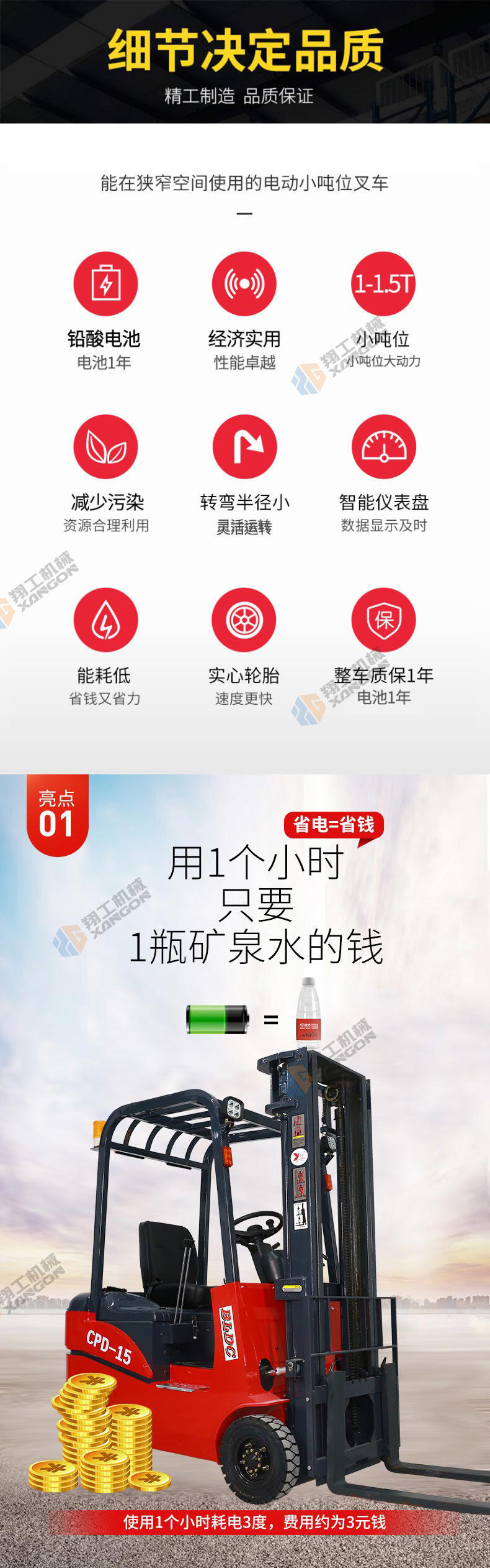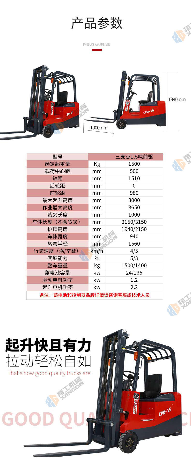 三支點CPD1.5噸前驅電動升降液壓電動叉車