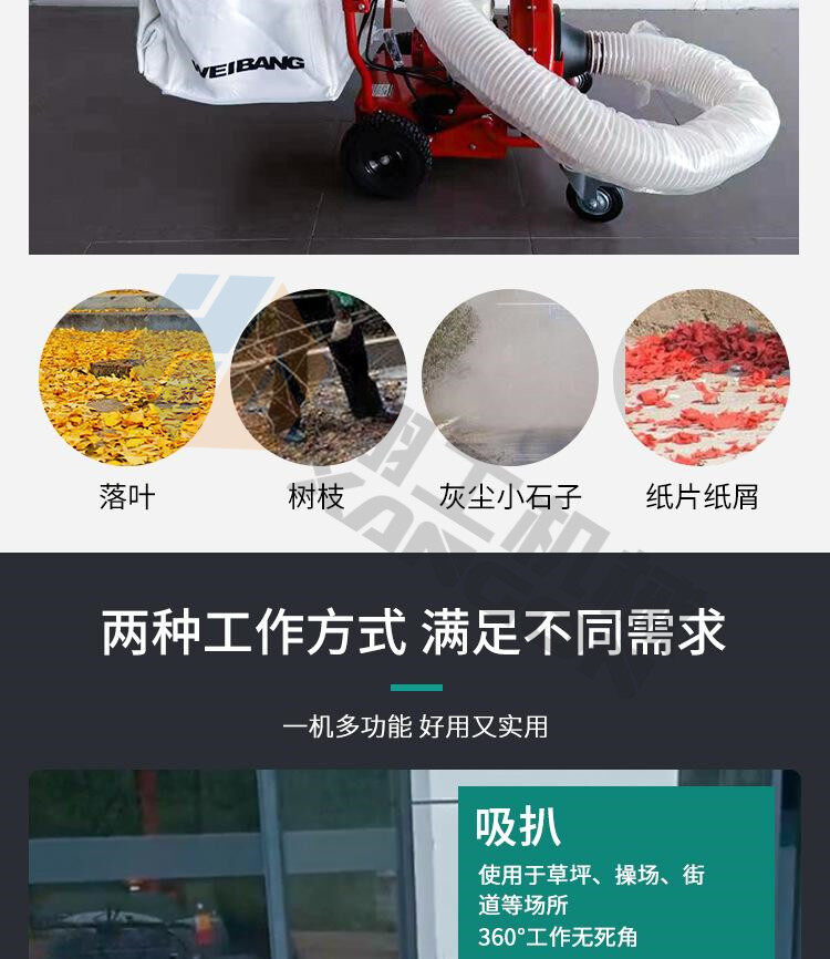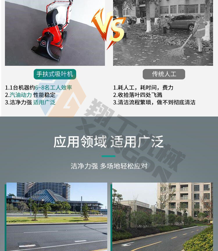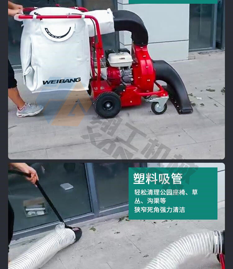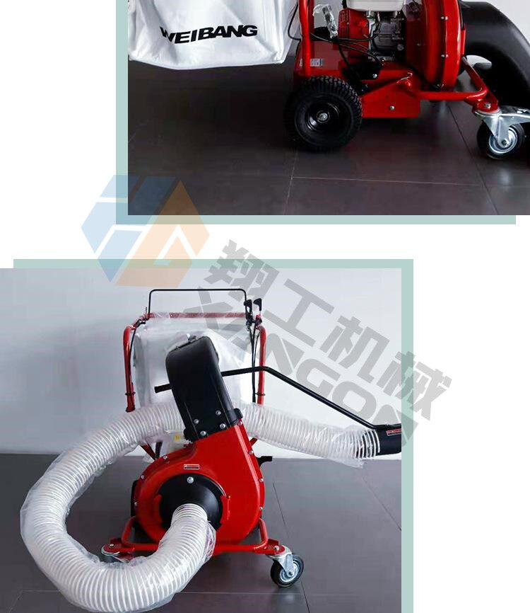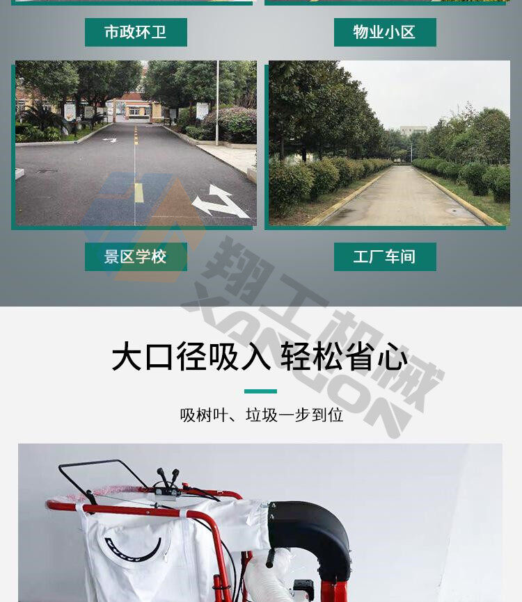 該設備工作效率高,比人工清掃效率高幾倍,可手推助力行走。垃圾儲存袋采用便捷式方式,便于更換垃圾,且使用成本較低。吸口可配置延長管,用來吸收綠化帶中的落葉和垃圾。吸口高度可調,面對落葉較厚或大的法桐樹葉較多的區域,也能輕松收集干凈。目前以用在環衛人行道、園林、物業小區、校園、公園、廣場、工廠廠區和車間等得到廣泛應用。