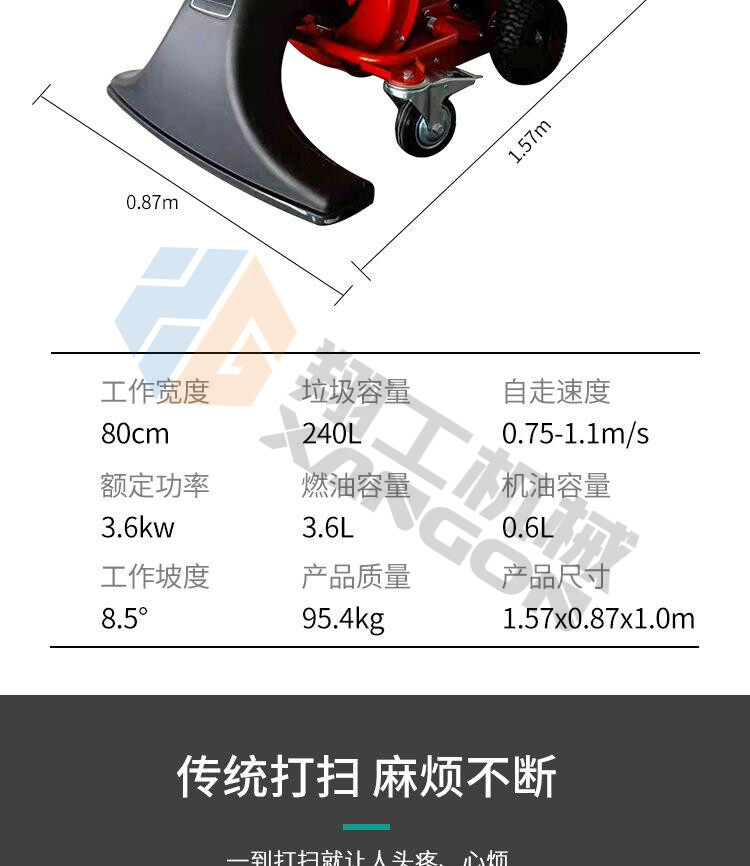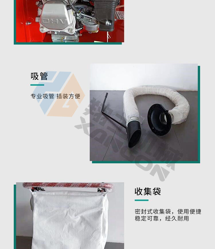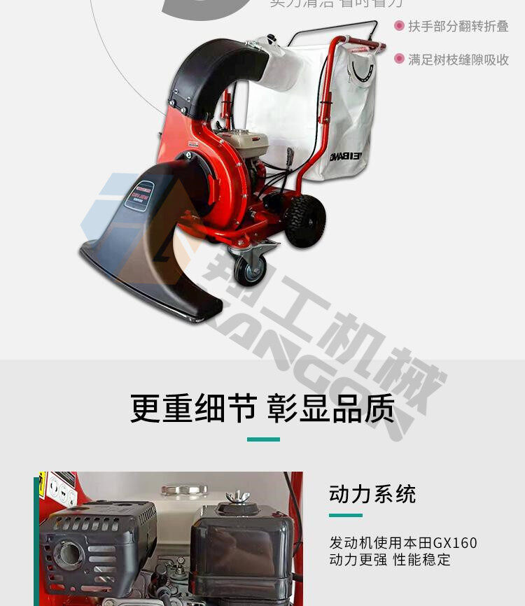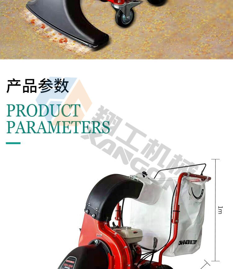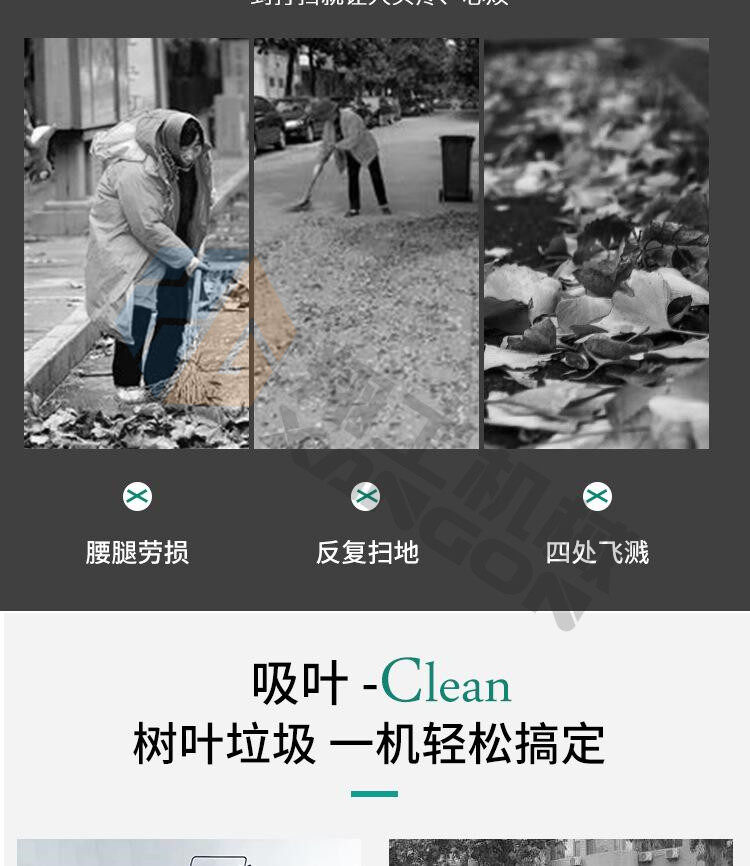 該設備工作效率高,比人工清掃效率高幾倍,可手推助力行走。垃圾儲存袋采用便捷式方式,便于更換垃圾,且使用成本較低。吸口可配置延長管,用來吸收綠化帶中的落葉和垃圾。吸口高度可調,面對落葉較厚或大的法桐樹葉較多的區域,也能輕松收集干凈。目前以用在環衛人行道、園林、物業小區、校園、公園、廣場、工廠廠區和車間等得到廣泛應用。