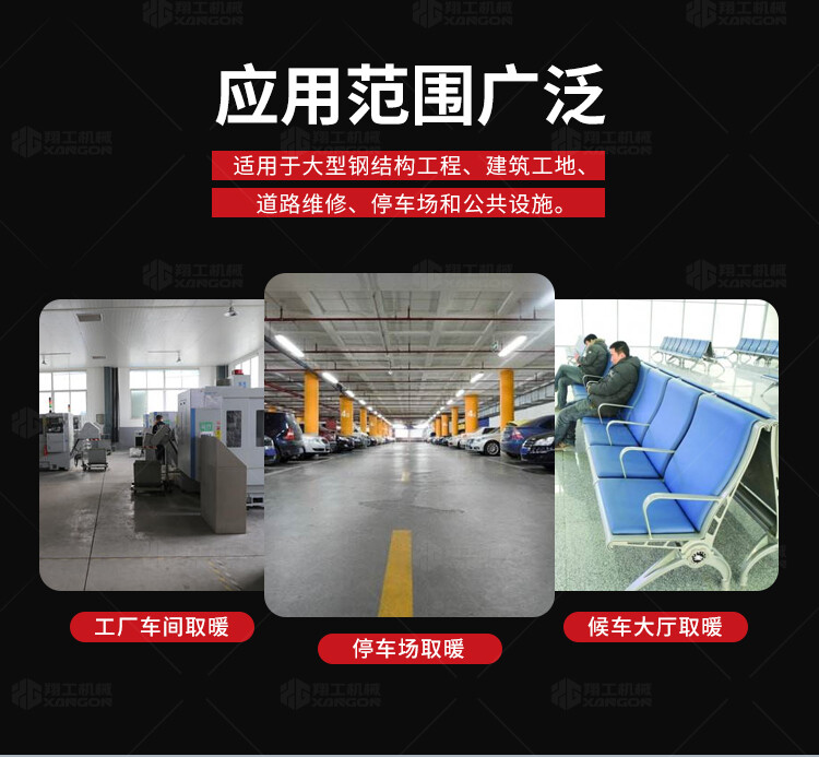此款燃氣暖風機適用于工廠車間、辦公室、酒店、酒吧、飯店、餐廳、大廳、展廳、咖啡店.天井、花園、步行街、站亭、運動館、步行街、大型會議室、別墅庭院及戶外休閑等空氣流通好的場所。
