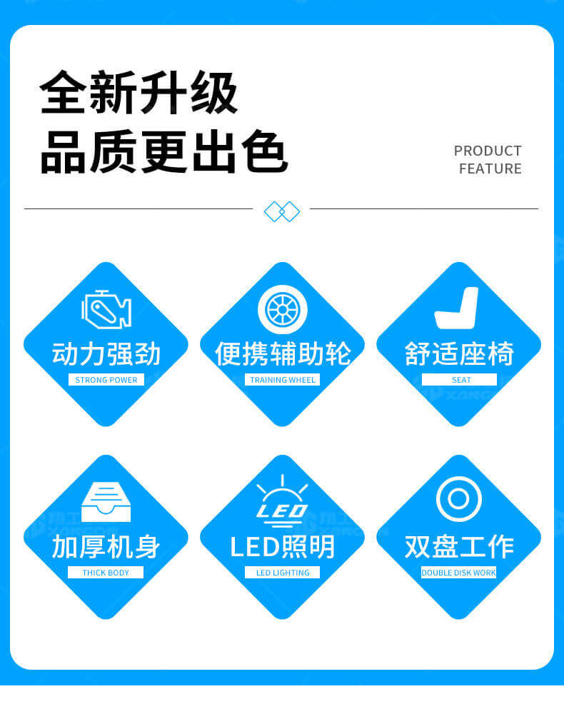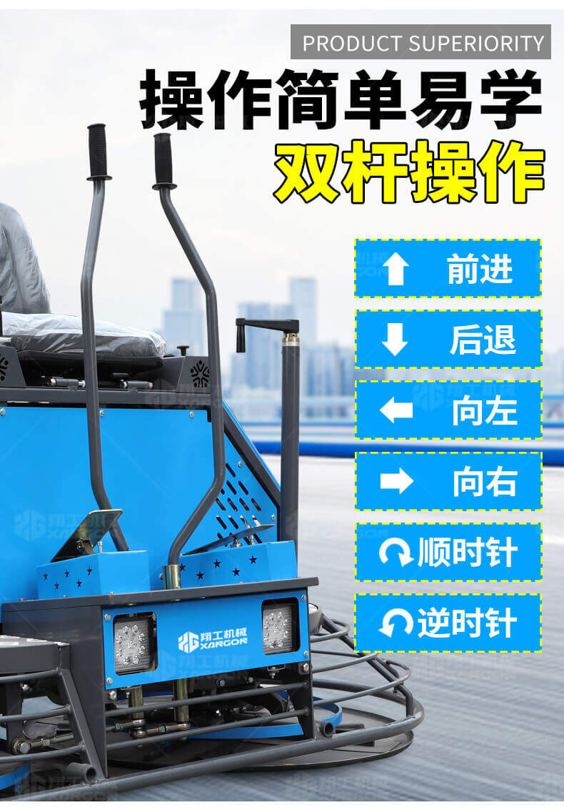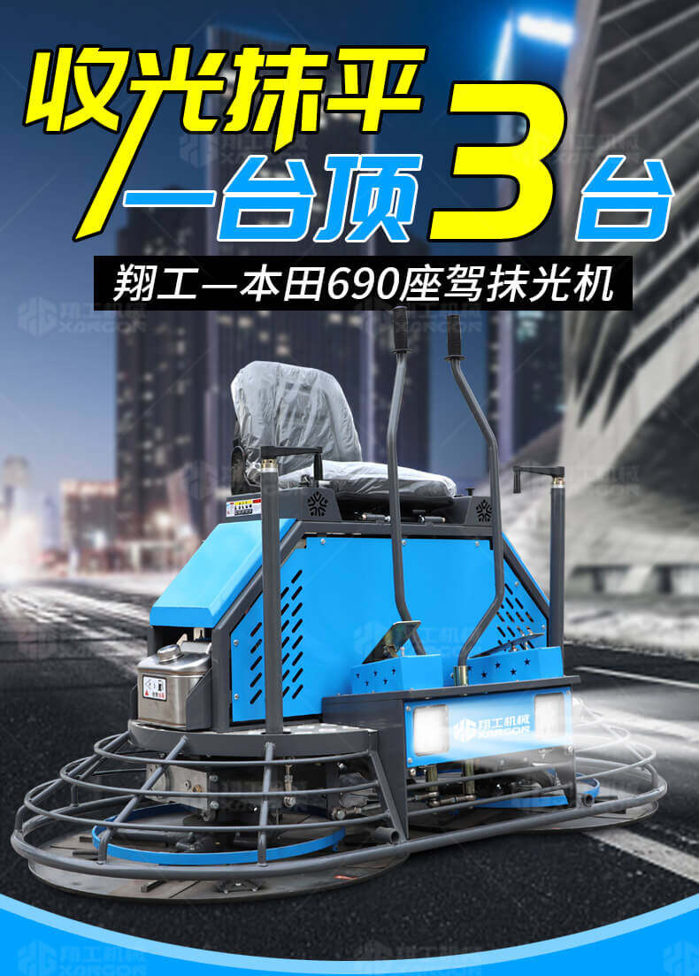 座駕式混凝土抹光機用于混凝土地面的提漿、壓實、抹平、抹光,相對于手扶式抹光機,效率高。