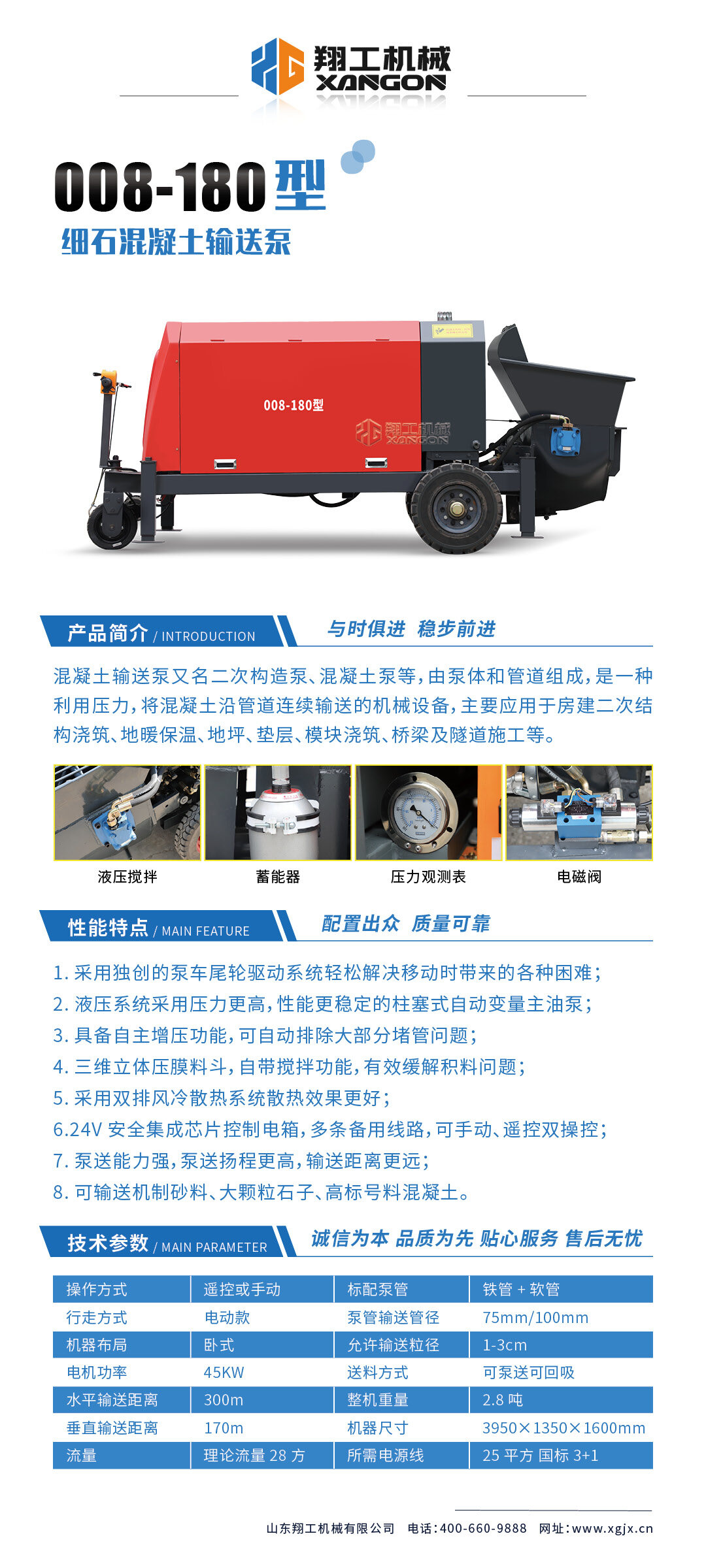采用獨創的泵車尾輪驅動系統輕松解決移動時帶來的各種困難;采用雙排風冷散熱系統散熱效果更好,液壓系統采用壓力更高,性能更穩定的柱塞式自動變量主油泵,采用先進的三維立體壓模一體式自動攪拌料斗可輸送機制砂,高標號混凝土,有效緩解積料問題。