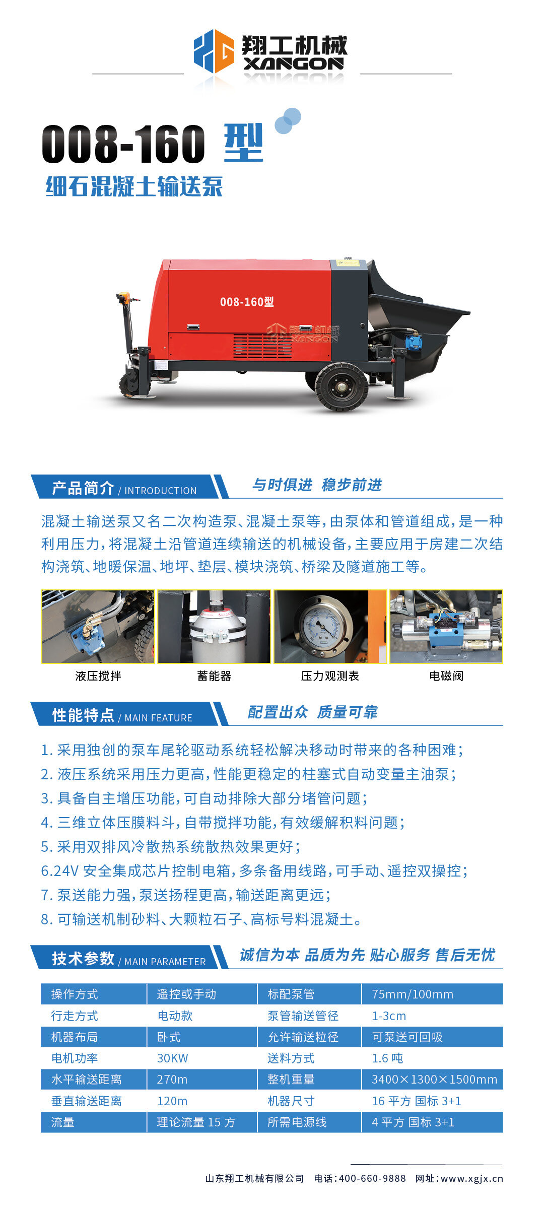 采用獨創的泵車尾輪驅動系統輕松解決移動時帶來的各種困難,采用雙排風冷散熱系統散熱效果更好,液壓系統采用壓力更高,性能更穩定的柱塞式自動變量主油泵,采用先進的三維立體壓模一體式自動攪拌料斗可輸送機制砂,高標號混凝土,有效緩解積料問題。