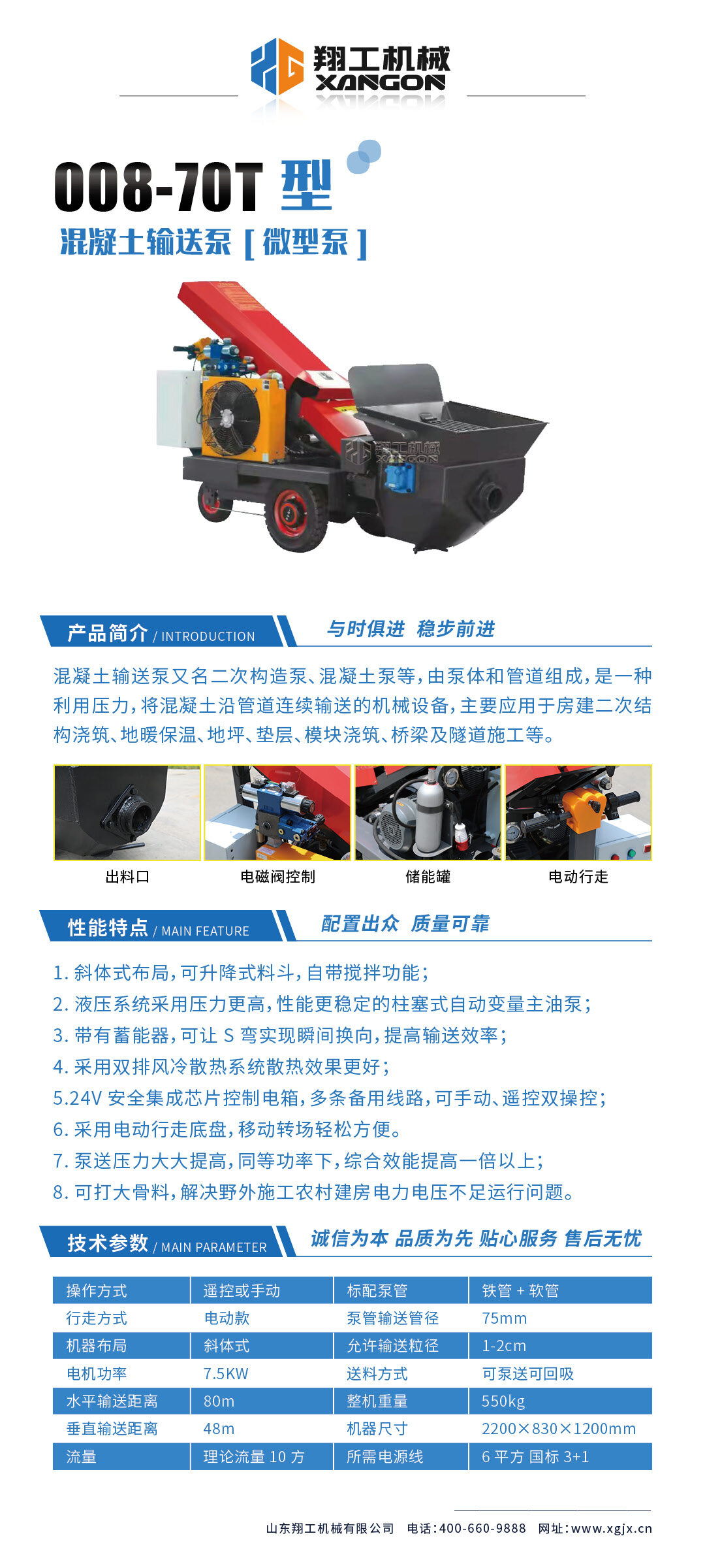 采用電動(dòng)行走底盤,斜體式布局升降料斗,采用雙排風(fēng)冷散熱系統(tǒng)散熱效果更好,液壓系統(tǒng)采用壓力更高,性能更穩(wěn)定的柱塞式自動(dòng)變量主油泵,料斗自帶攪拌功能防止骨料沉淀造成堵管,泵送壓力大大提高,同等功率下,綜合效能提高一倍以上。由于其功率較小,能打大骨料,解決了野外施工,尤其是農(nóng)村建房電力電壓不足,不能滿足大功率設(shè)備運(yùn)行的問題。