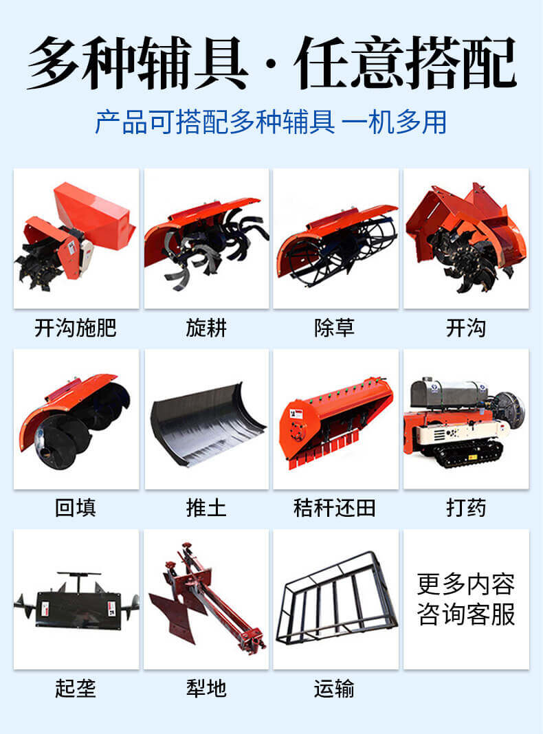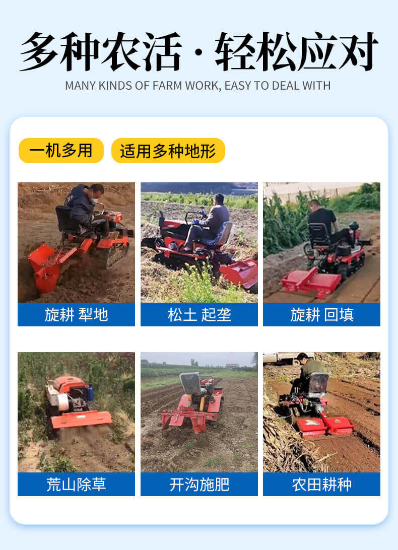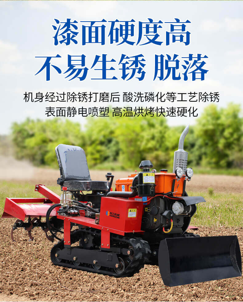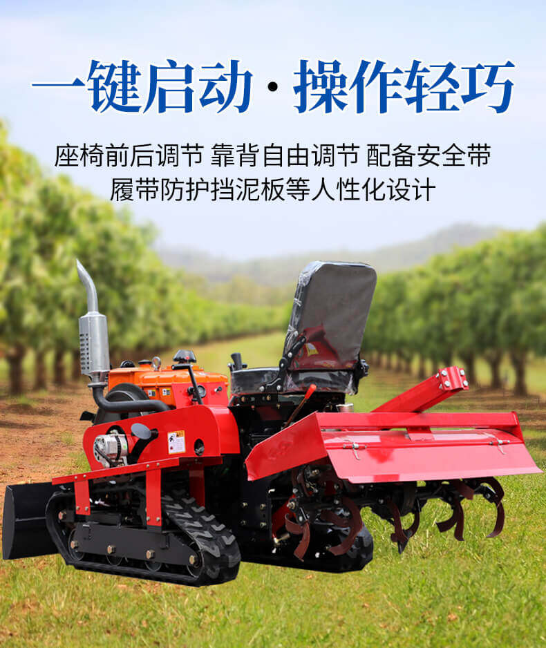 25馬力旱地履帶旋耕機適用于大面積、小面積清除雜草,適用于果園、農田、玉米地、山地的除草作業,打藥/旋耕/犁地/開溝施肥/回填/除草/起壟都可以。